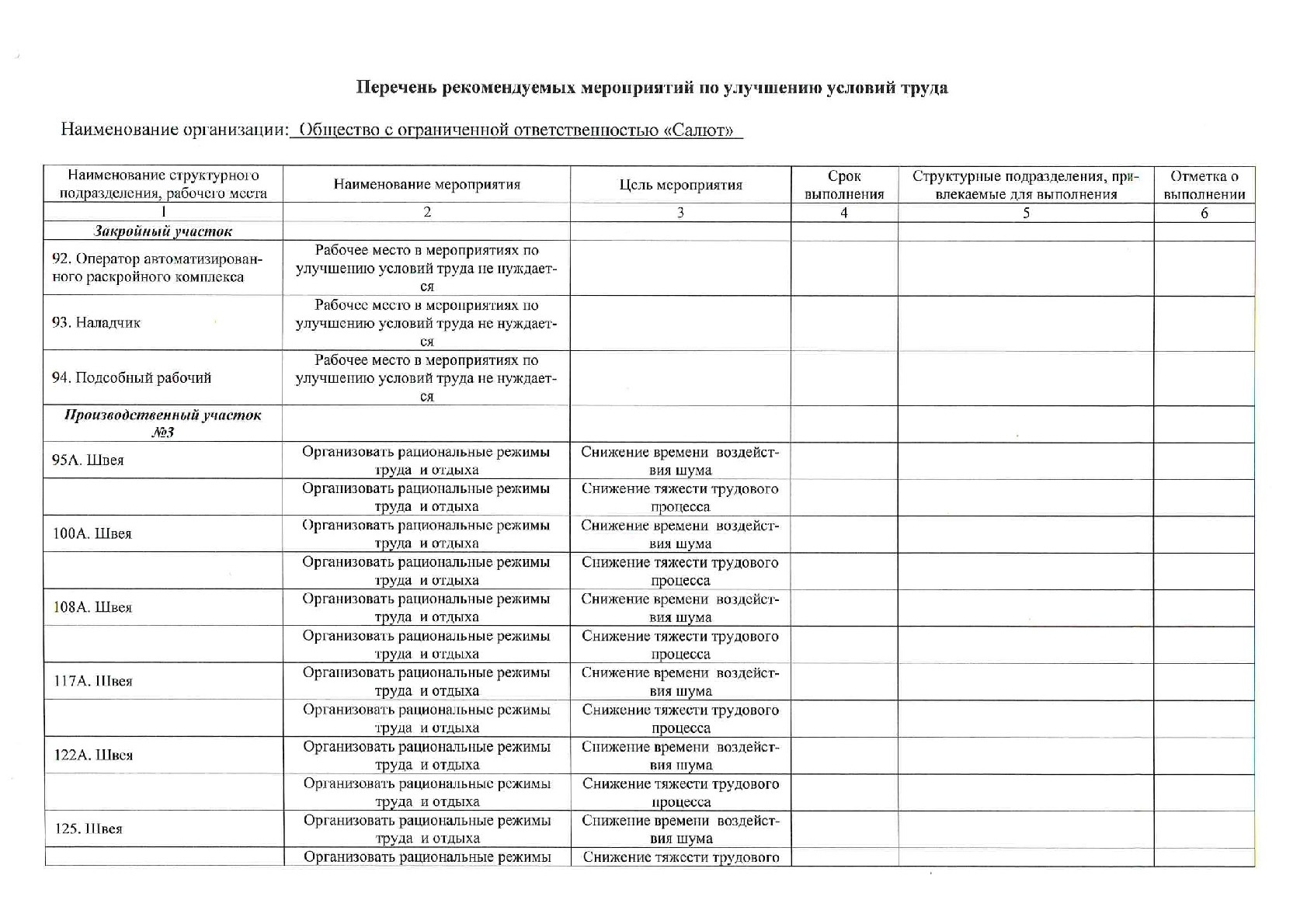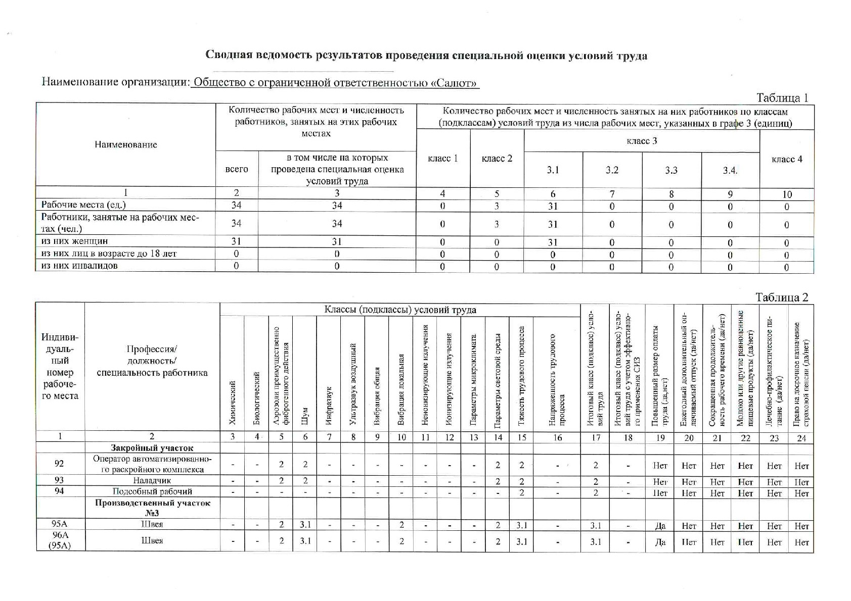 Сводная ведомость результатов проведения специальной оценки условий труда ООО «Салют»
