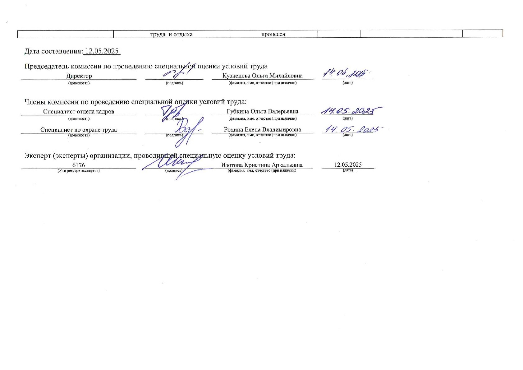 Сводная ведомость результатов проведения специальной оценки условий труда 15.05.2025